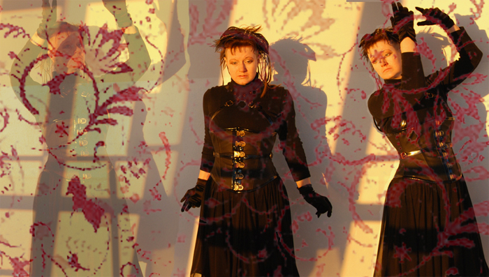 Der nächste Traum führte Katharin nicht in den Bettensaal, sondern in einen Ballsaal. Er hatte hohe Fensterwände, die von schweren dunklen Samtvorhängen eingerahmt wurden. Er war noch größer und weitläufiger als der Hauptsaal im "Mute". Die Wände waren mit blaßfarbigen Barock-Ornamenten verziert. Eine Reihe großer Spiegel lief ringsum. An der Decke hingen vier Reihen von Kronleuchtern, die Leuchtdioden statt Kerzen trugen. Fahlgraues Tageslicht lugte zwischen den Fensterstreben hindurch und ließ die Tanzfläche hell schimmern. Die Gäste waren prachtvoll kostümiert und frisiert, einige historisch, andere postmodern und im Cyberstyle. Katharin trug eine Mischung aus allem: eine Steckfrisur mit vielen Kunstzöpfchen, eine große schwarze Haarschleife im Cosplay-Stil, ein graues Steampunk-Korsett aus Kunststoff und einen durchsichtigen schwarzen Flatterrock.